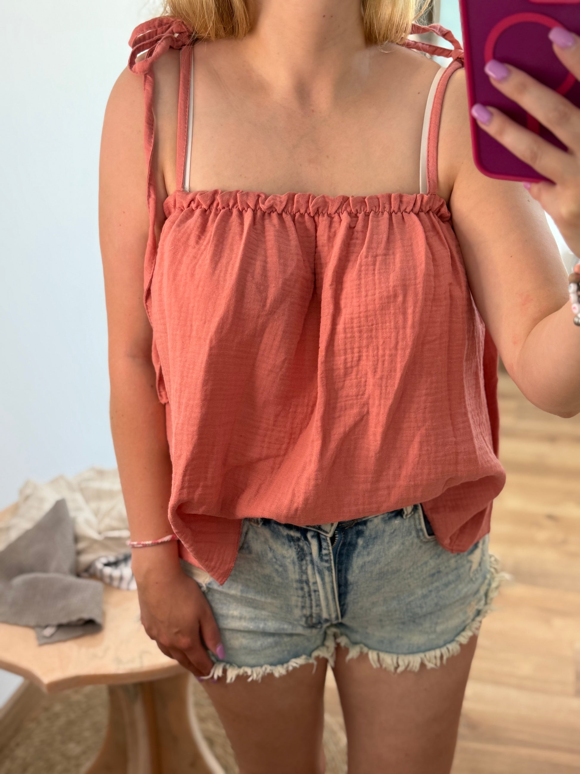 Obtenez le look estival parfait avec le Haut Aria ! Ce top léger en gaze de coton est doté de bretelles ajustables ornées de jolis noeuds. Polyvalent et élégant, il convient à toutes les tailles, du 36 au 44. Profitez du confort et de la fraîcheur de ce haut, idéal pour les journées ensoleillées.