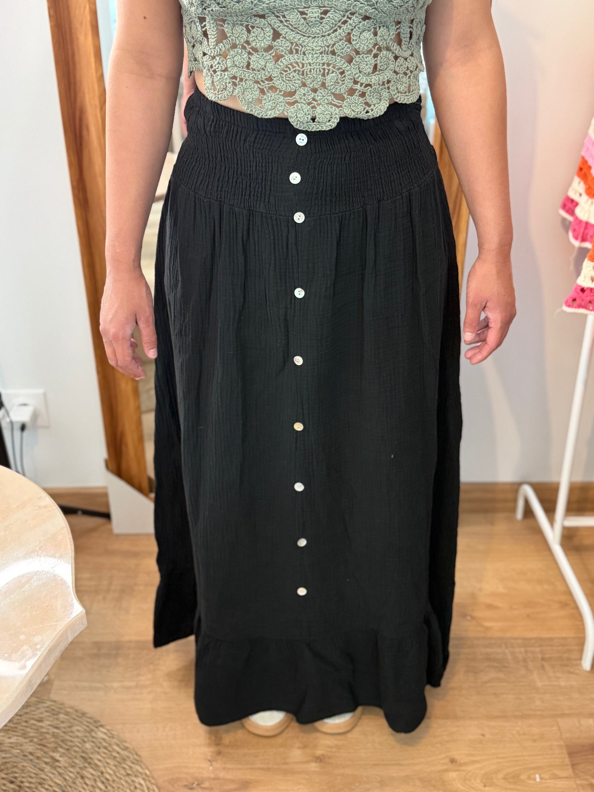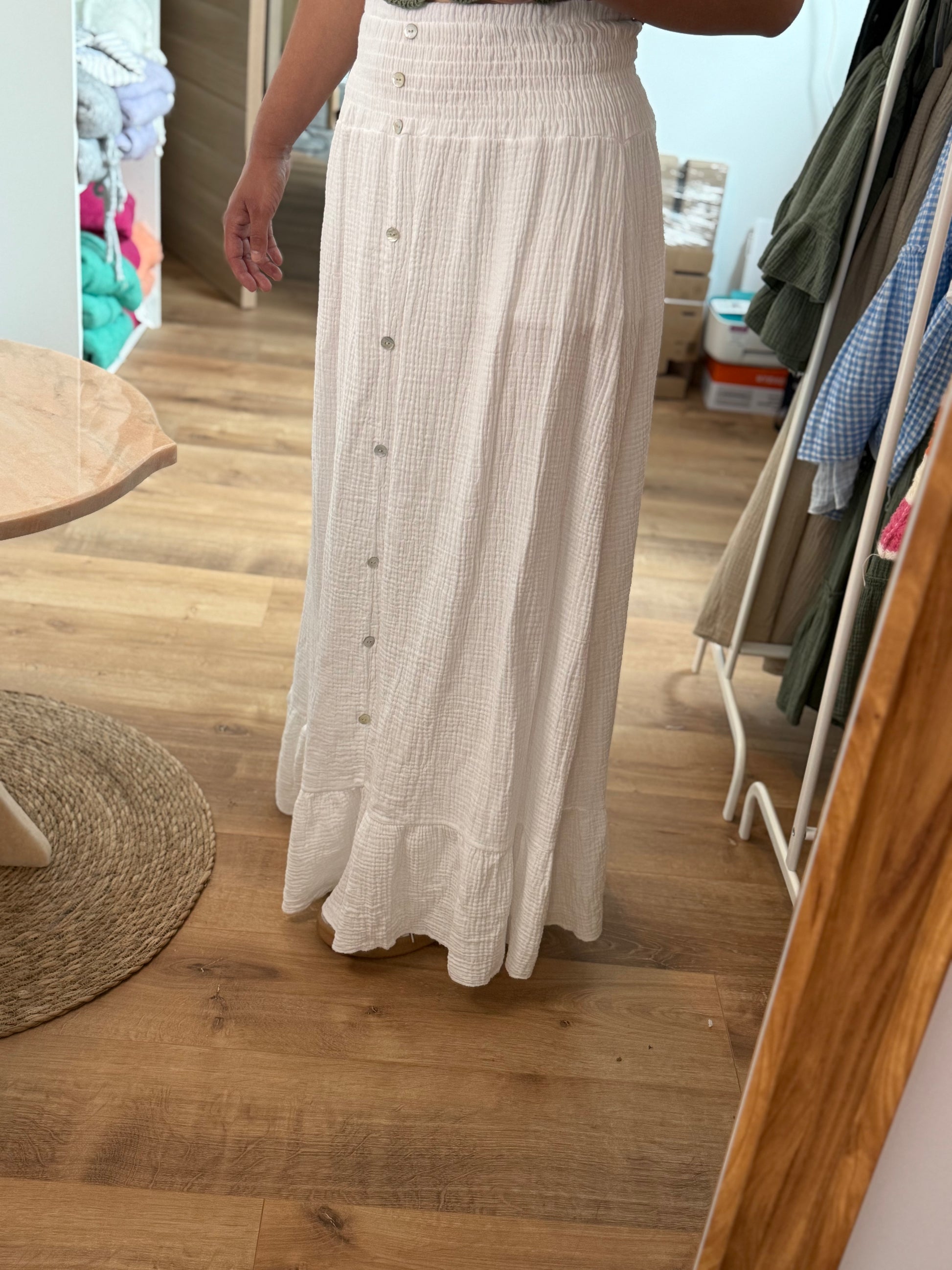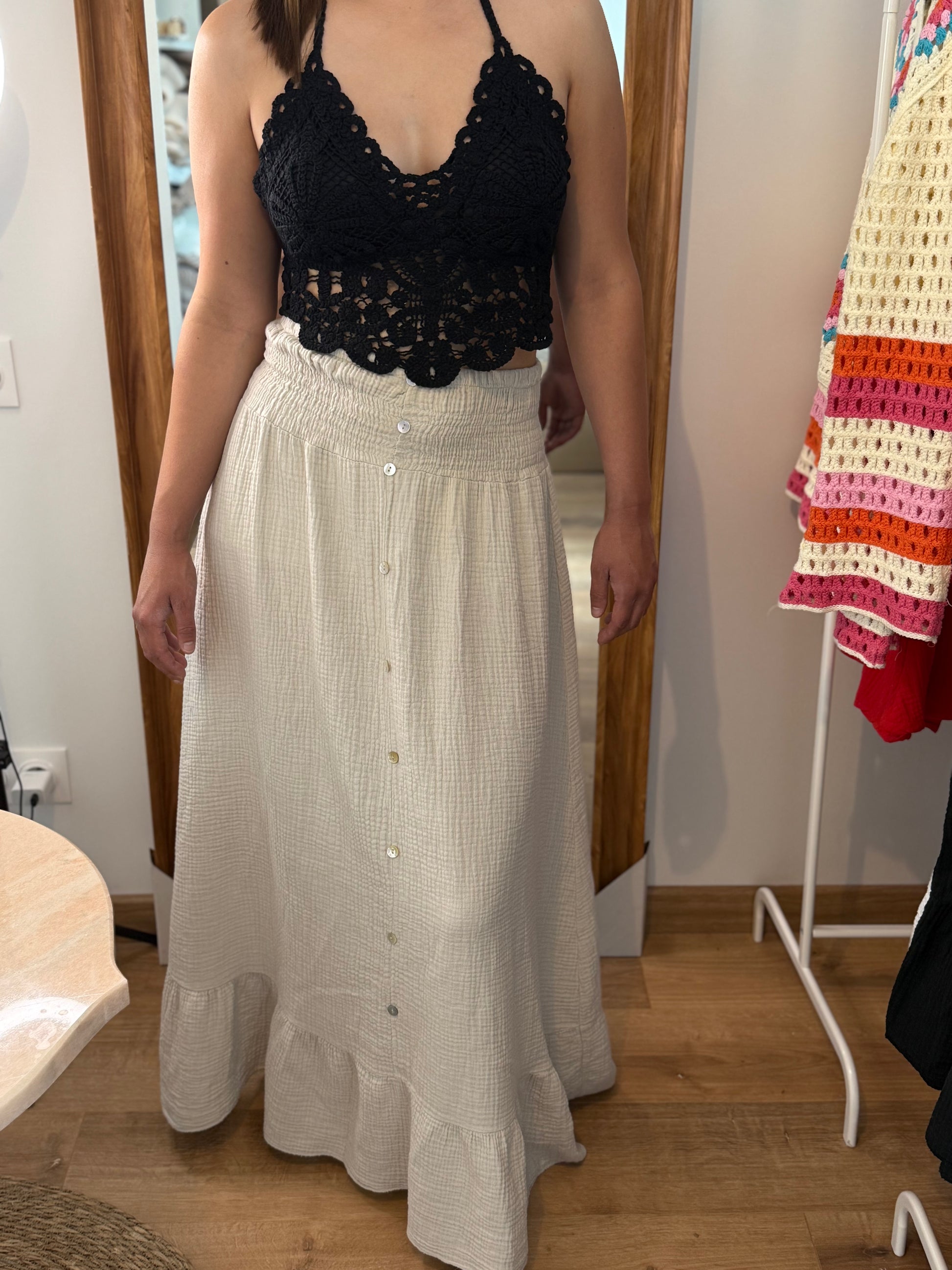Apportez une touche bohème chic à votre dressing avec la jupe Leila, confectionnée en gaze de coton 100% doux et respirant. Sa taille smockée assure un ajustement parfait, tandis que sa coupe fluide garantit une liberté de mouvement optimale. Les boutons disposés sur le devant ajoutent une élégance discrète, idéale pour accompagner vos journées ensoleillées ou vos soirées décontractées avec style et confort.
