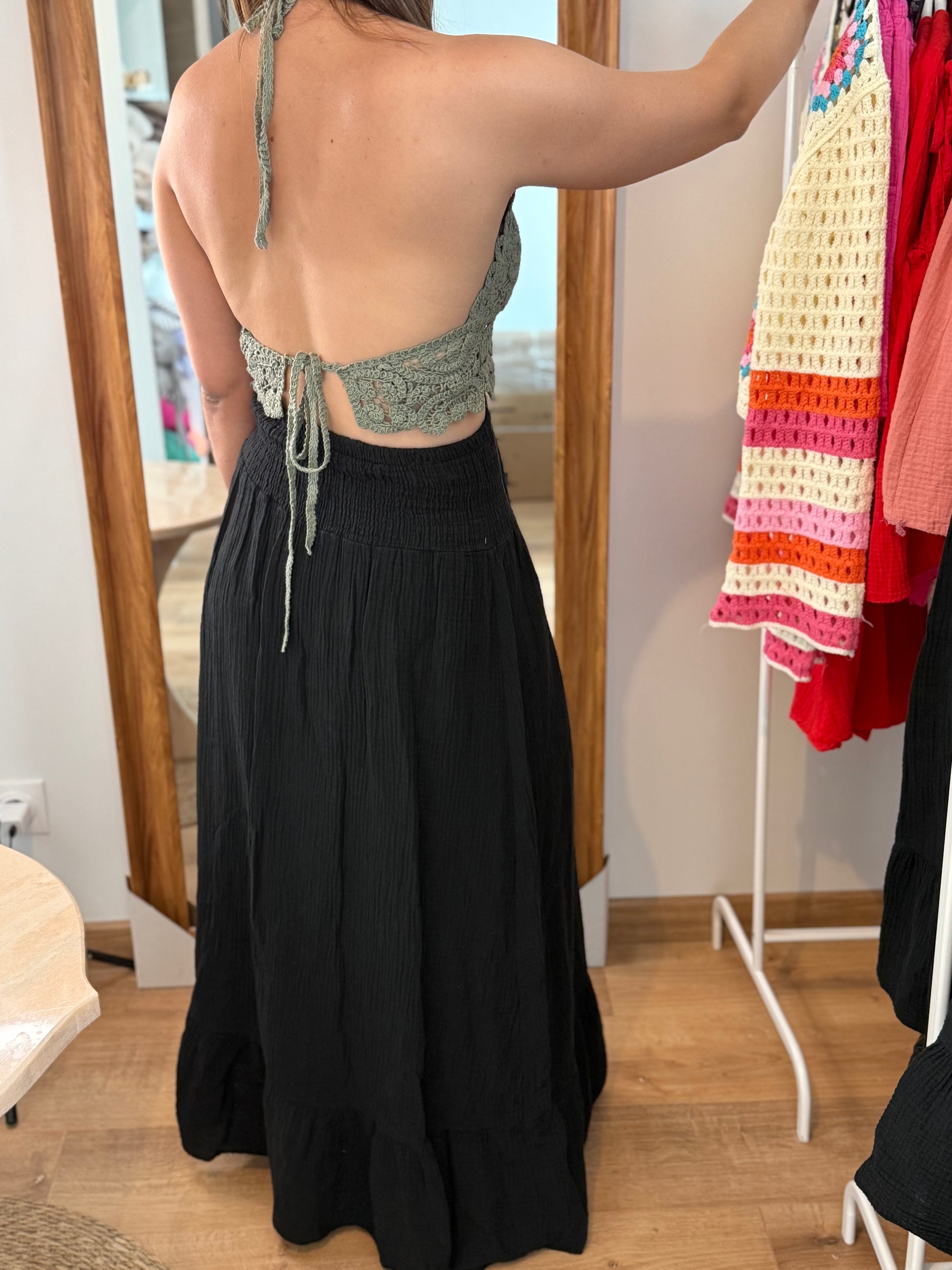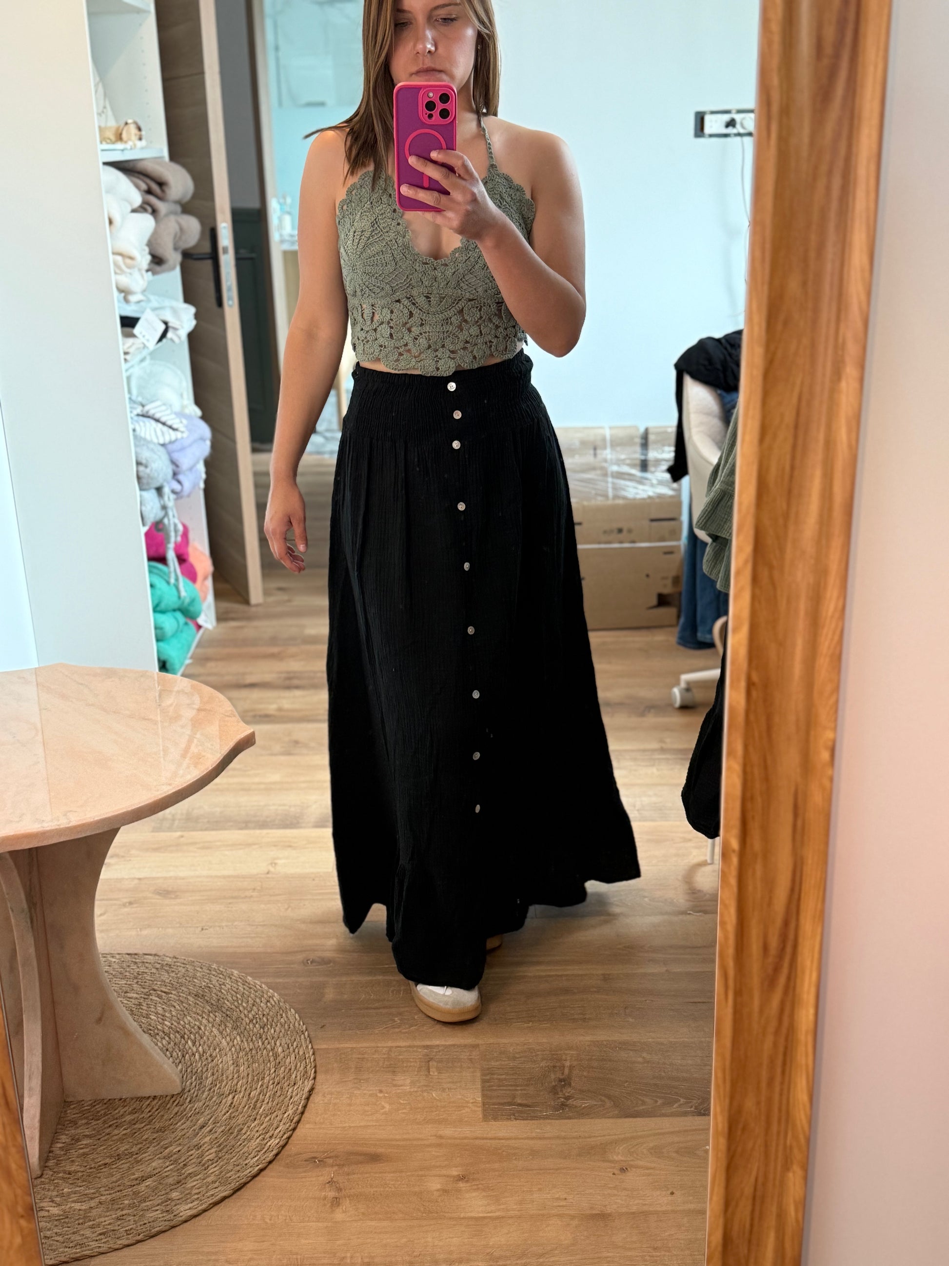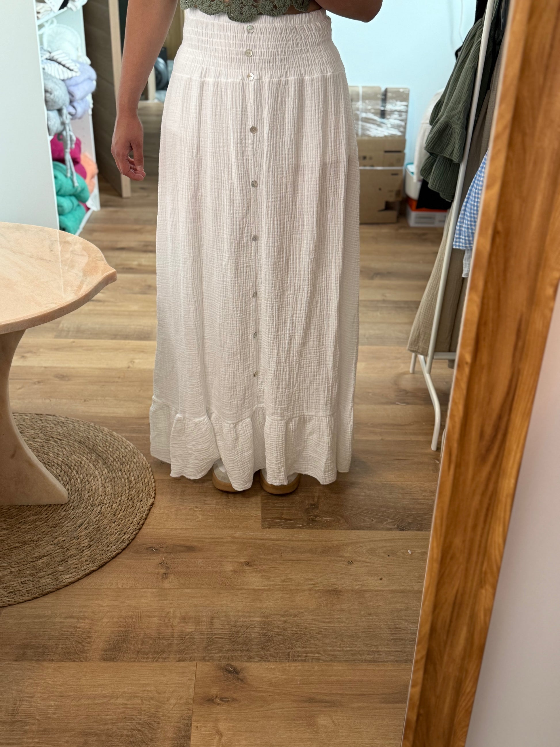 Apportez une touche bohème chic à votre dressing avec la jupe Leila, confectionnée en gaze de coton 100% doux et respirant. Sa taille smockée assure un ajustement parfait, tandis que sa coupe fluide garantit une liberté de mouvement optimale. Les boutons disposés sur le devant ajoutent une élégance discrète, idéale pour accompagner vos journées ensoleillées ou vos soirées décontractées avec style et confort.