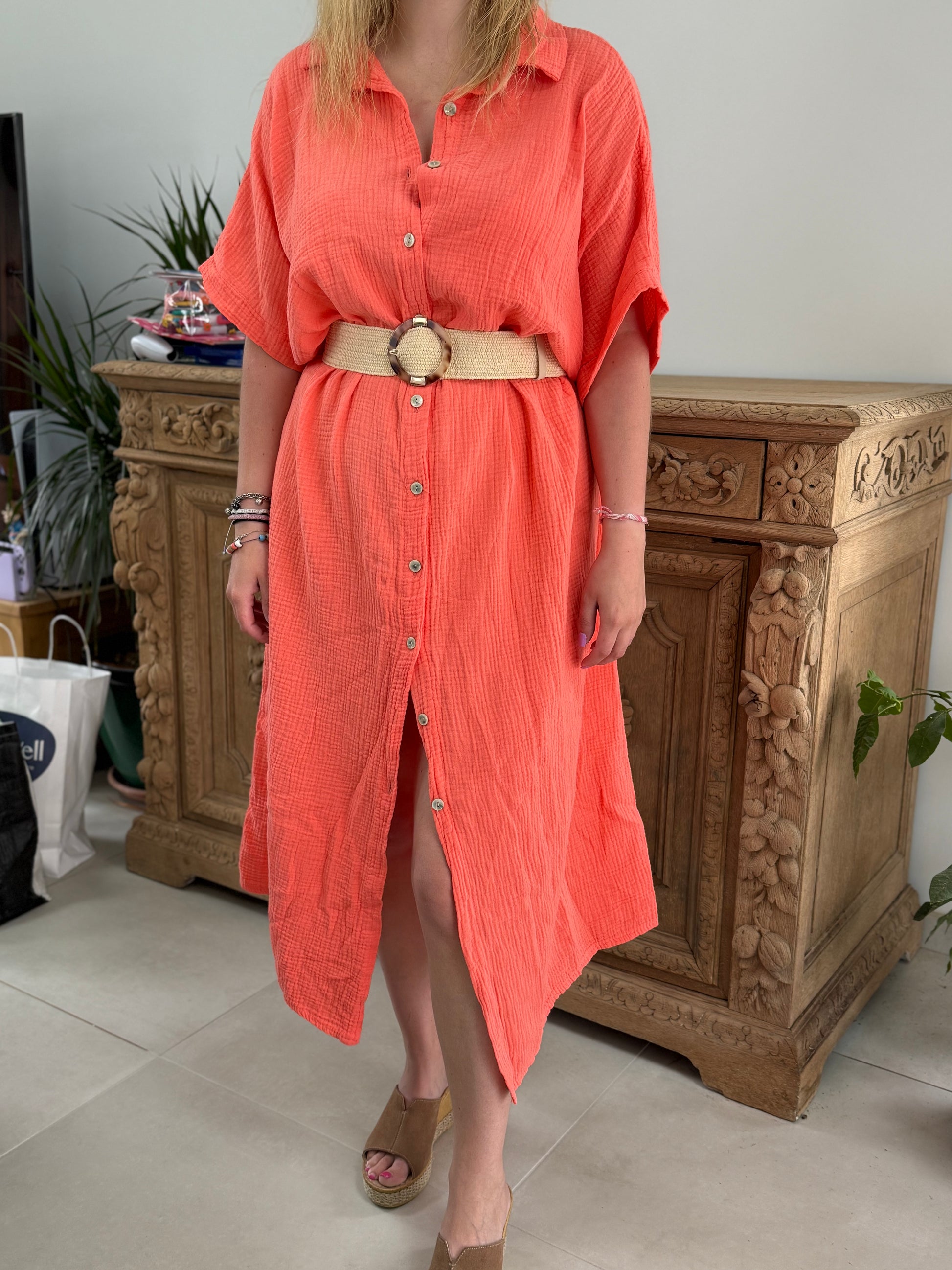 Profitez de confort et de style avec la robe Soraya en gaze de coton. Grâce à ses boutons et sa taille unique, elle convient parfaitement aux tailles 36 à 42. Son tissu léger et respirant vous apportera un confort optimal tout en vous donnant un look élégant.